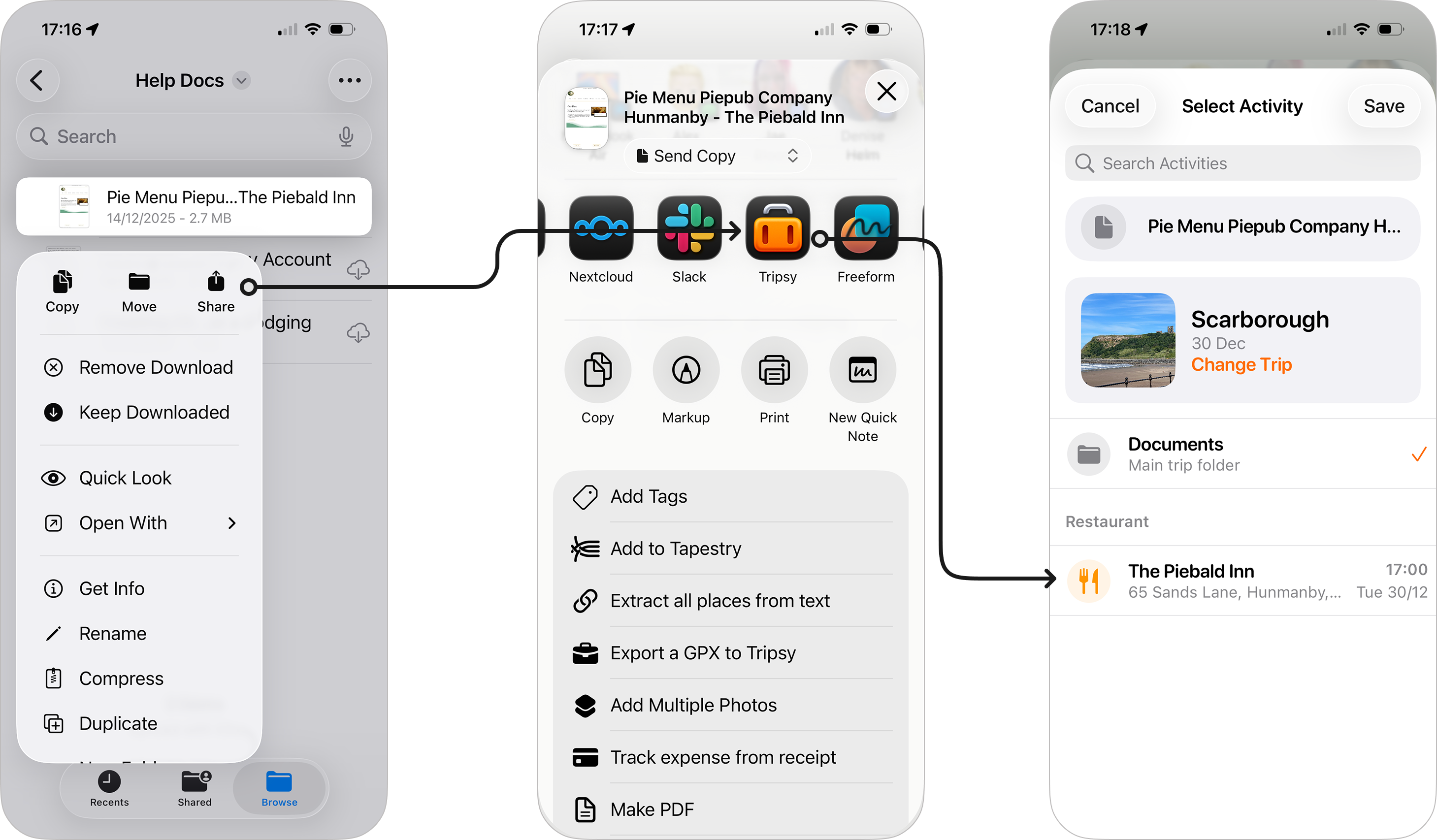 When you share the file to Tripsy you'll be asked to choose a trip (we'll default to your current trip) and then if you want this to be added to either the trip documents or a specific activity for that trip.