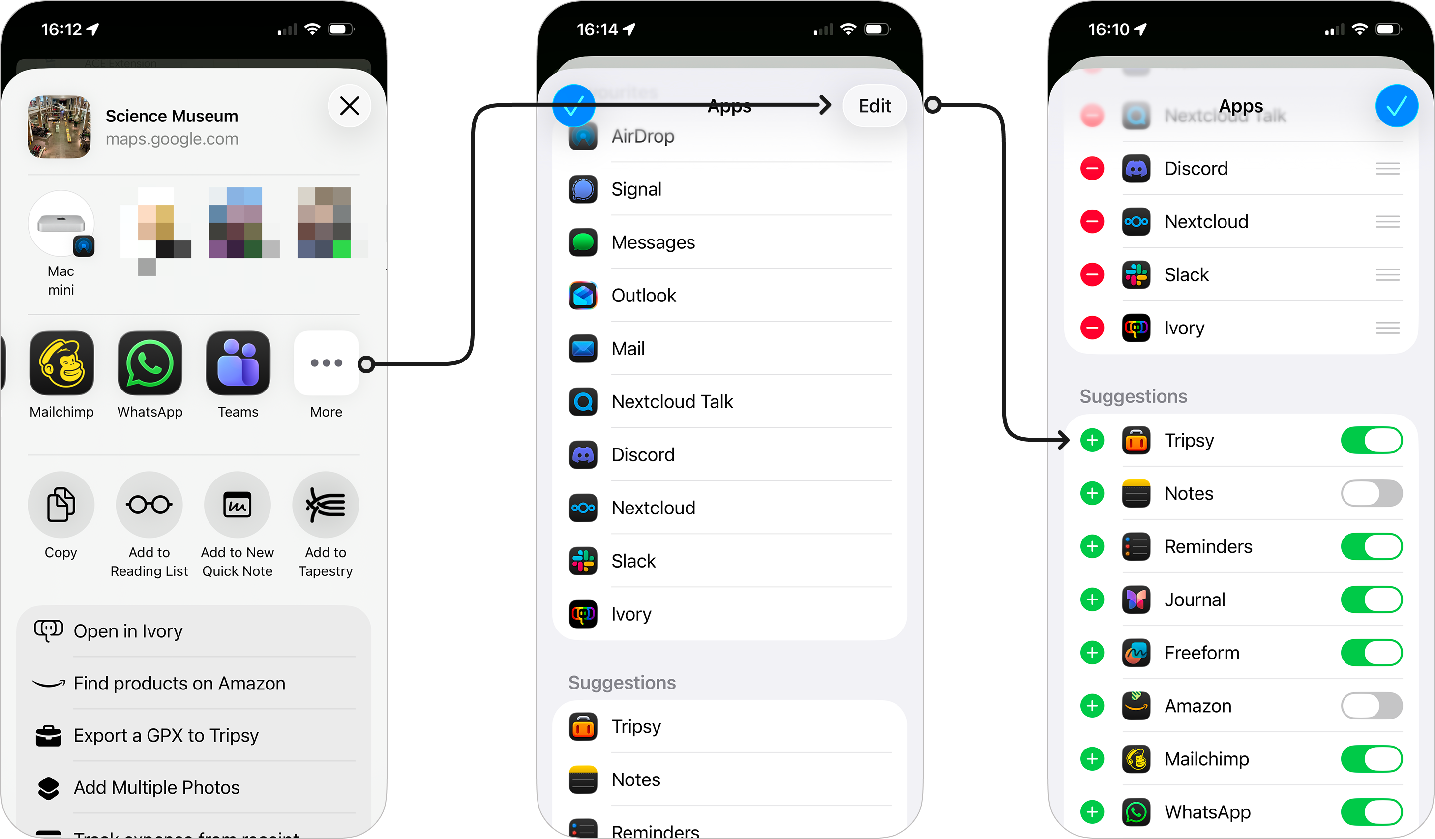 - If you wish, you can also use the three lines tot the right of each app to move their order, with items at the top being shown at the left of your share sheet.