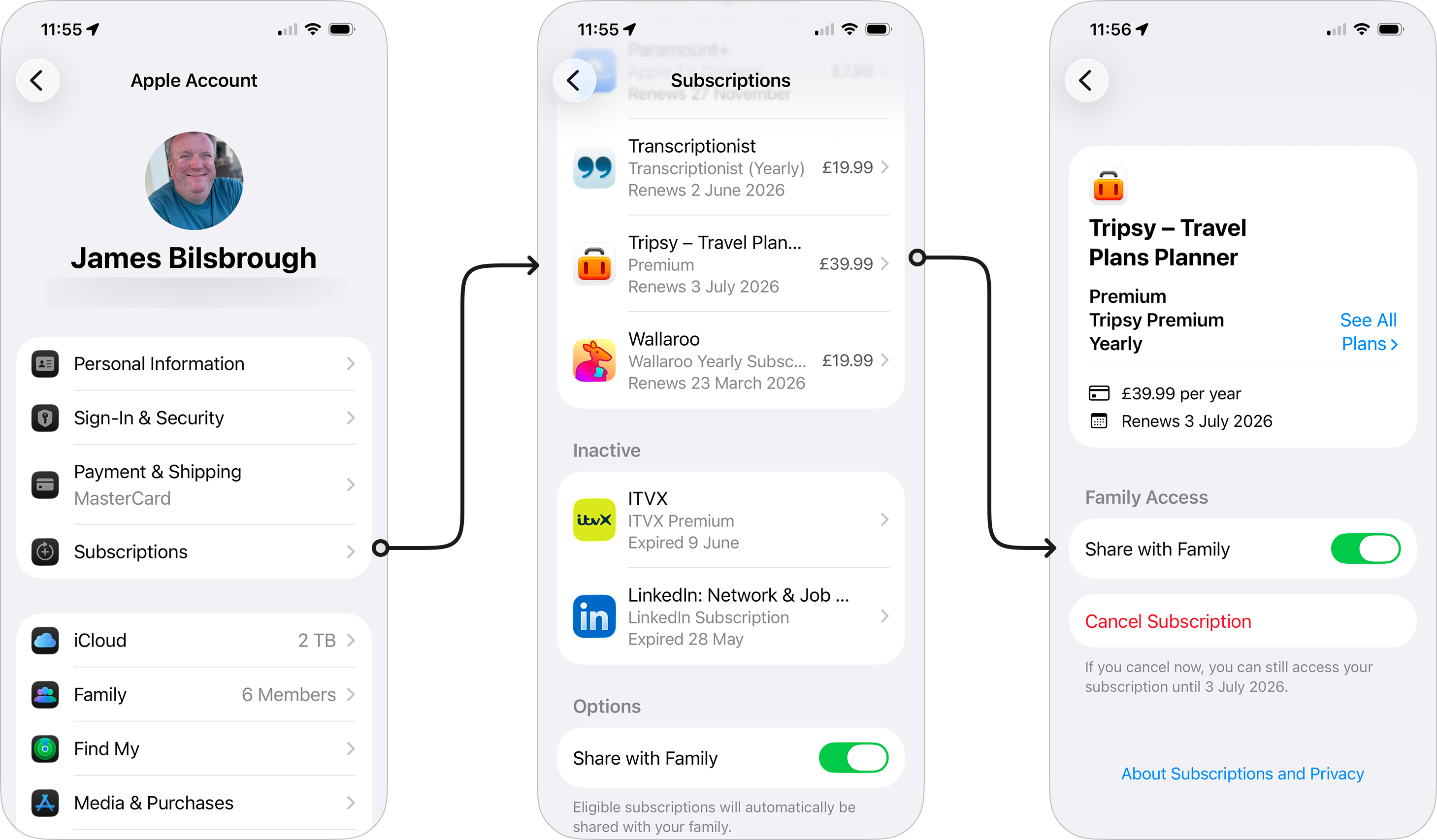 However, for existing subscribers, who subscribed before Family Sharing was enabled, you may need to enable Family Sharing for your Tripsy subscription by following these steps: