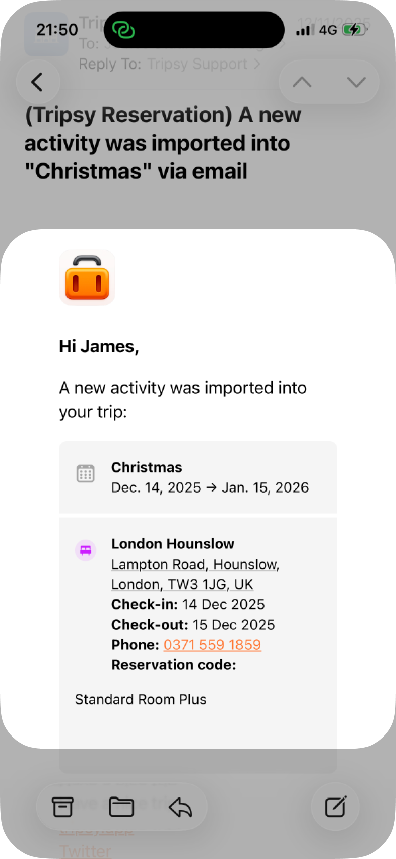 For common types of reservations (flights, hotels, trains, restaurants) we work with email parsing partners to attempt to turn those confirmation emails into the relevant activities within Tripsy.