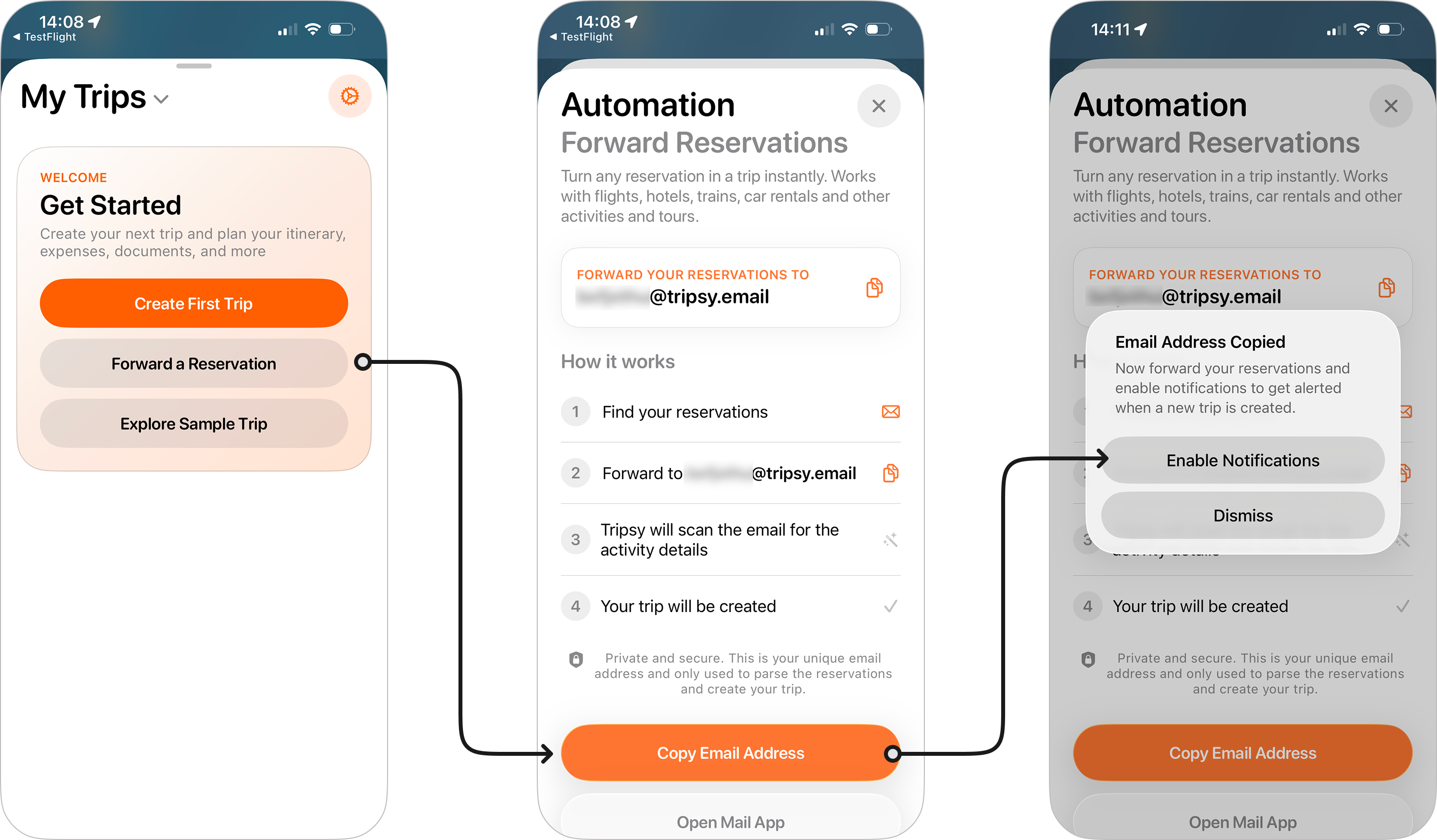 When you first install Tripsy as a new user, you'll see our onboarding tile with one of the options being Forward a Reservation. Tapping this will show you your unique Tripsy email address, you can forward your reservations to this address without having to setup any additional emails.