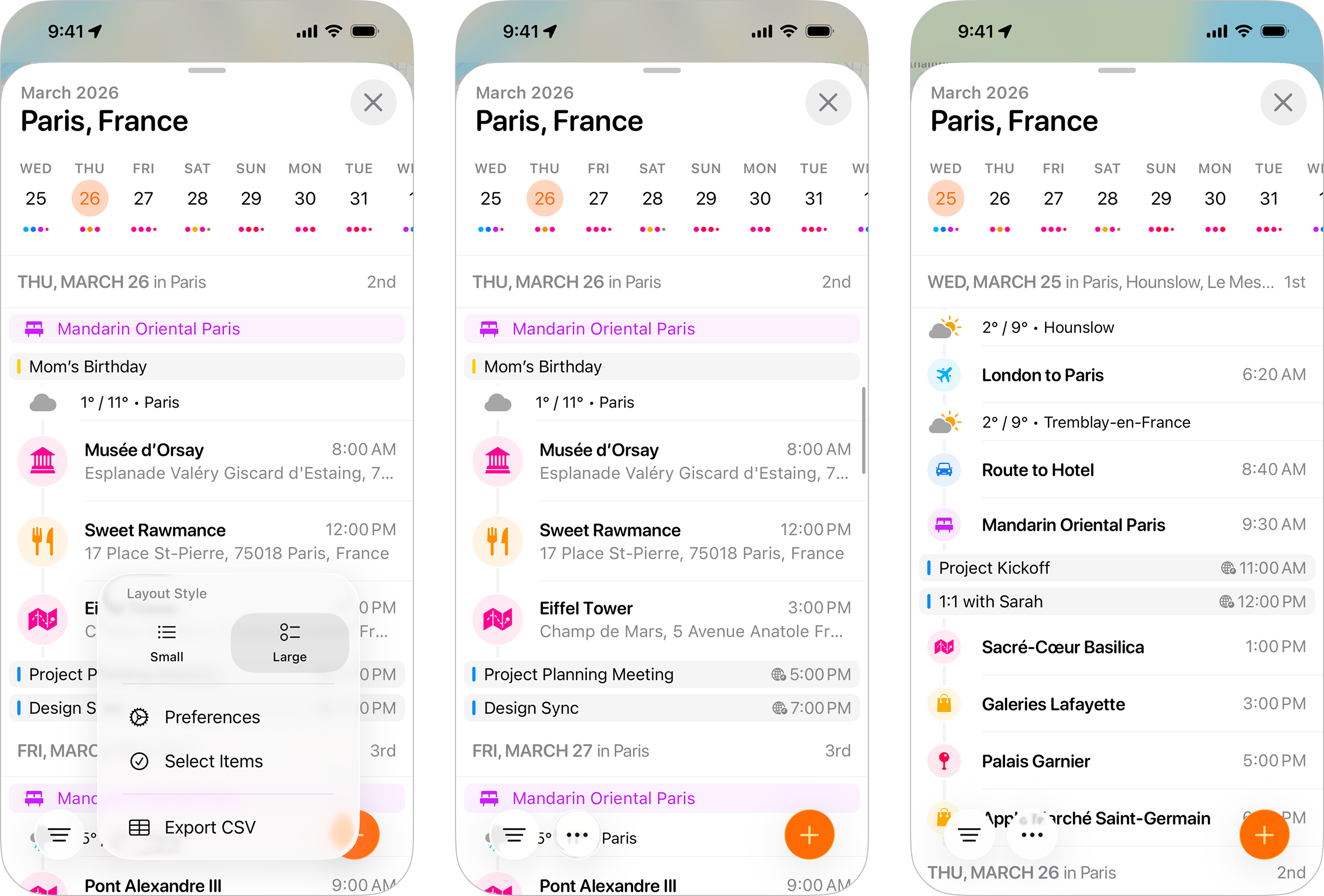 Starting with Tripsy 3.8, you can now choose a more compact view of your itinerary, as well as the original larger size. To change this, just tap on the three dots of the bottom left of your itinerary and you'll see the options for Small or Large under Layout Style: