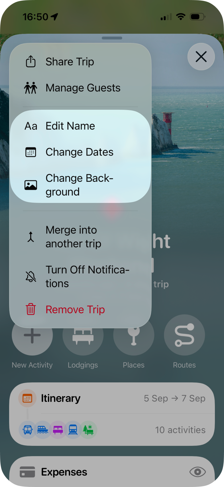 For trips at you own or are a collaborator on, you can change many of the details of your trip by tapping the three dots at the top-left of the trip where you'll see several options.