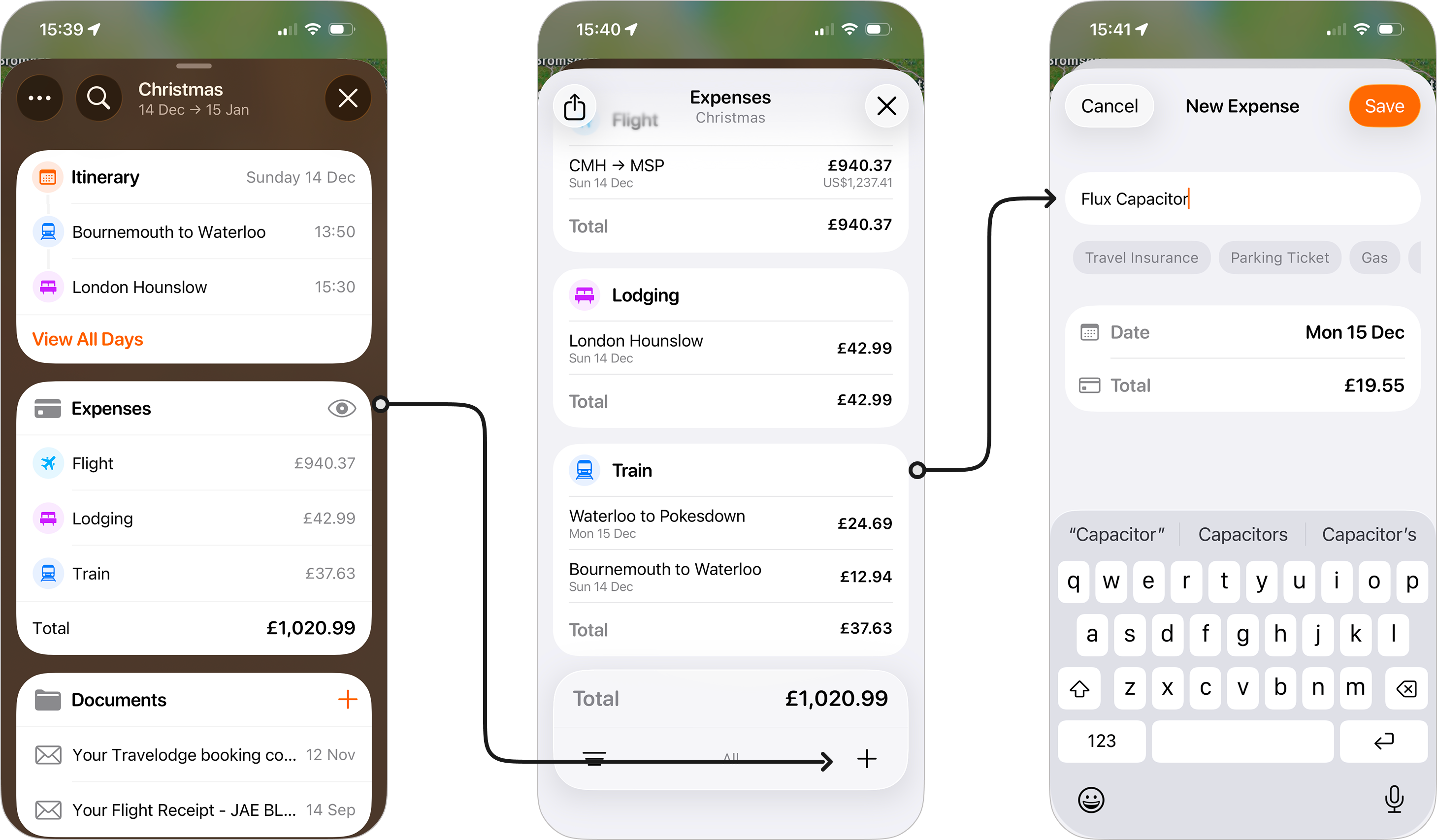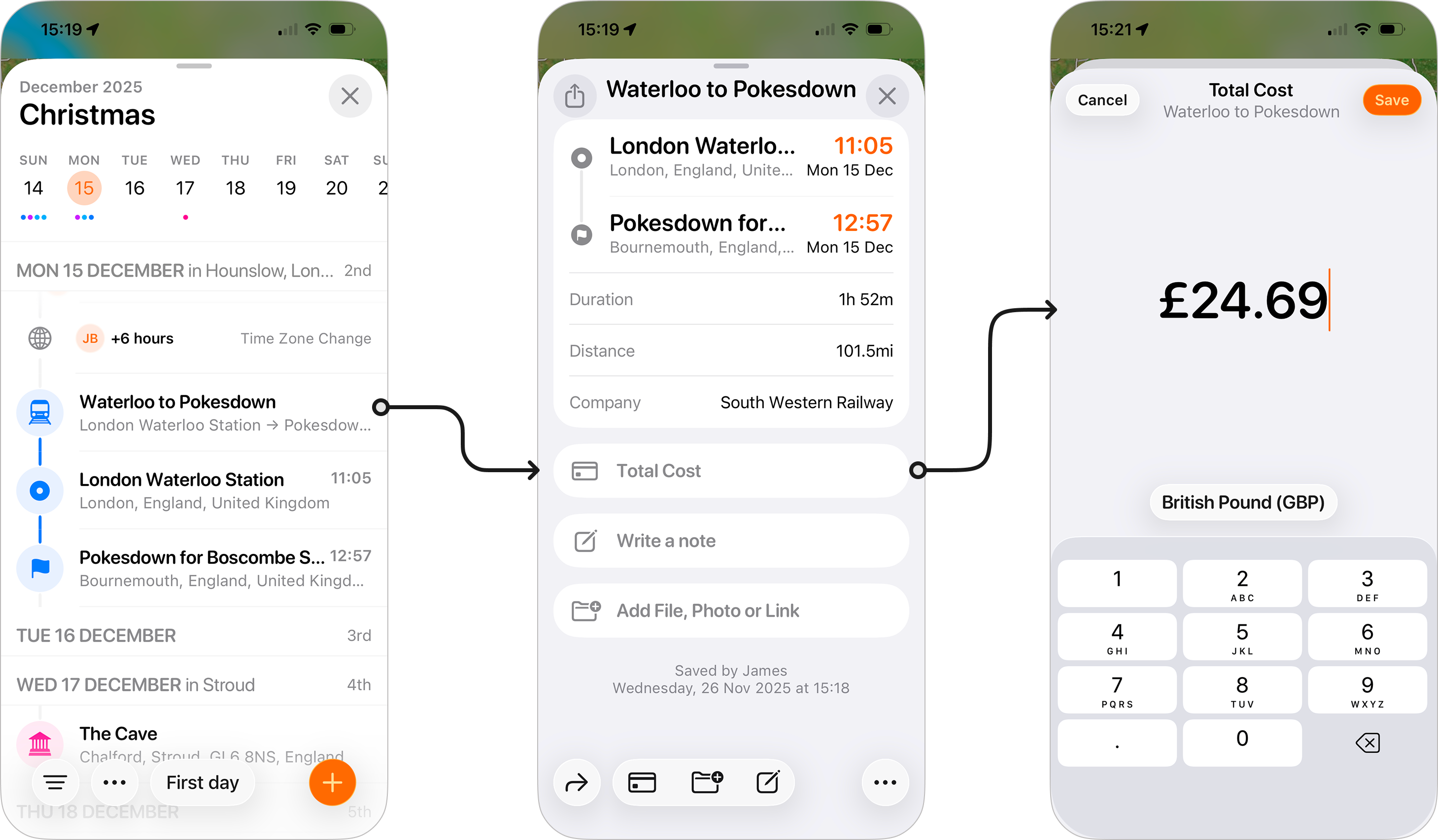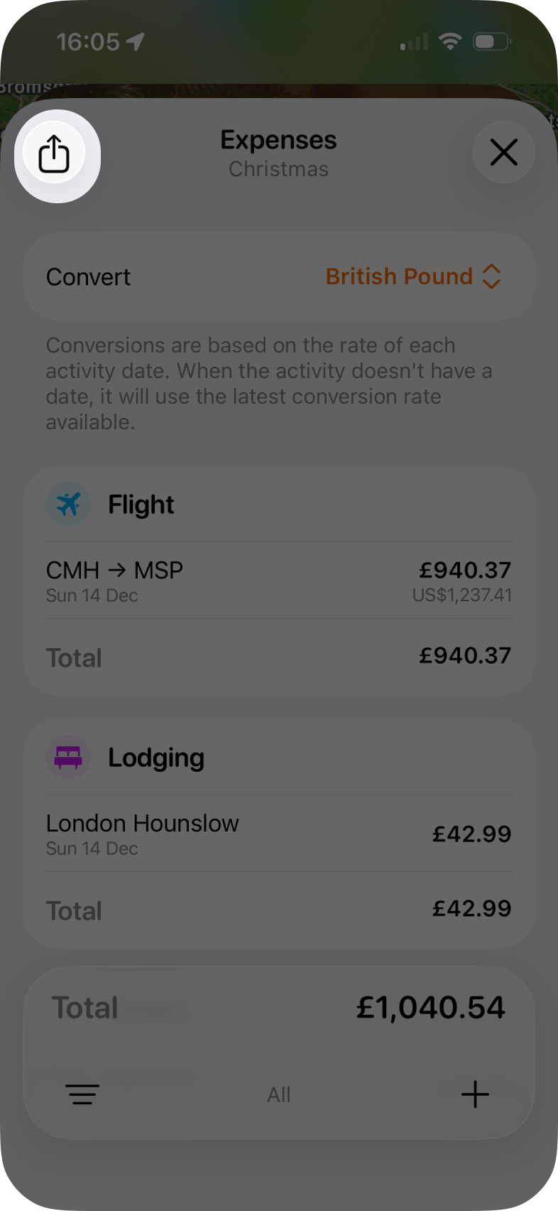 Whether it's the cost of your flight, your hotel stay, meals out, or the entrance fee to a museum, you can record all of these costs in Tripsy, and have the currency automatically converted for you as well as being to export those expenses to handy CSV file, perfect for those expense claims!