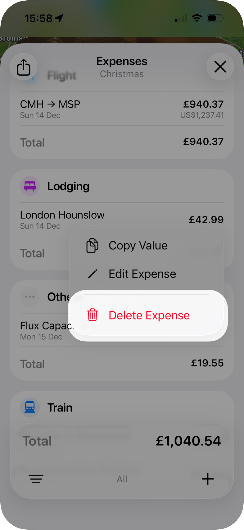 You can export all of your expenses for a particular trip by going into the Expenses list and then tapping the Share icon at the top-left of the list. You'll then have an option to Export CSV, tapping this will present you with the share sheet on iPhone and iPad or will open the file in your default app for CSV files on the Mac.