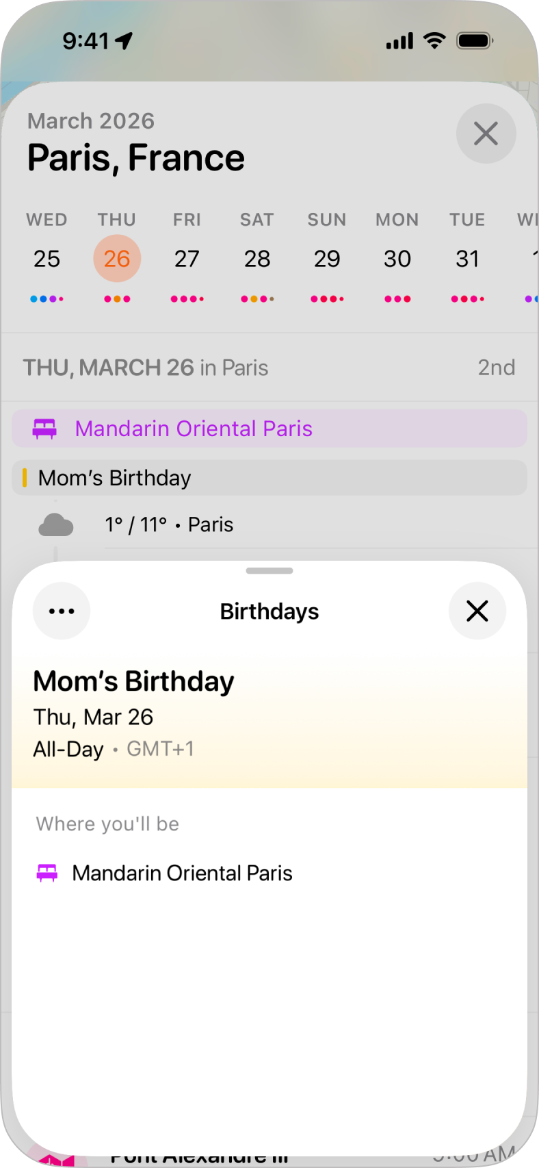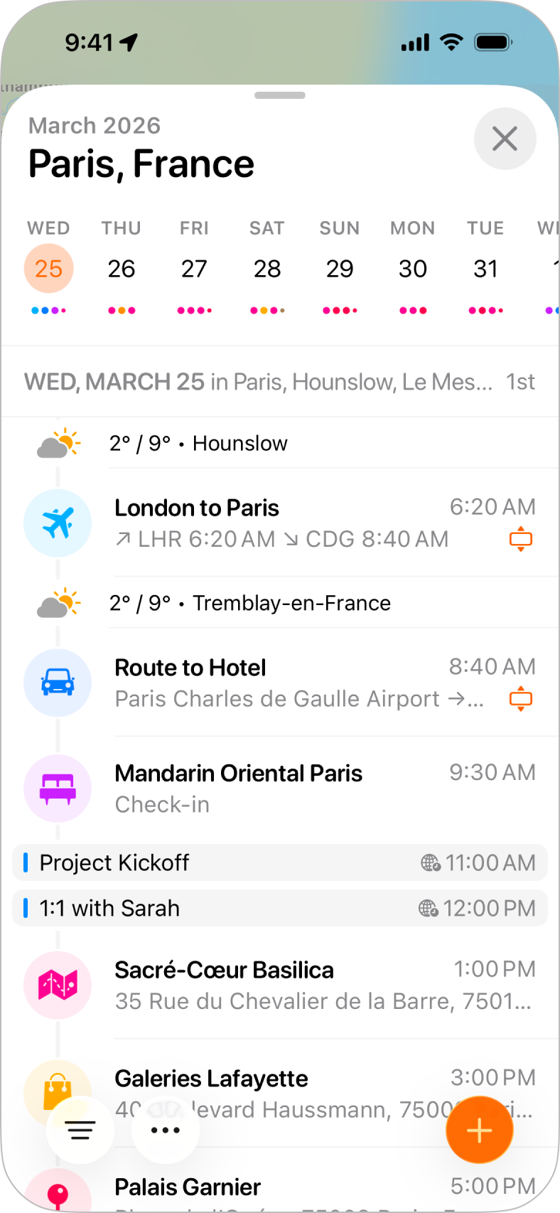 Your calendar events will appear in your itinerary as banners colored to match the color of the relevant calendar as chosen in the Calendar app. Calendar events will show in-between activities based on the date and time of the calendar event.