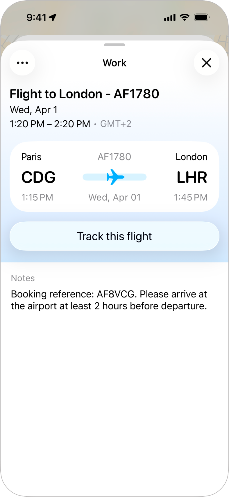 For flights, we're able to do some automatic detection and as long as your calendar event has a flight number along with the date and time of departure you'll see a Track Flight option when you view the details of the flight's calendar event, just tap this and we'll automatically add the flight as an activity for you.