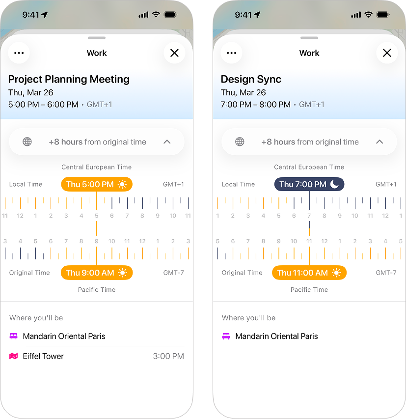 We've also created a handy way for you to see the time difference, with indications to show the local time based on your activities, and the original time of the event.