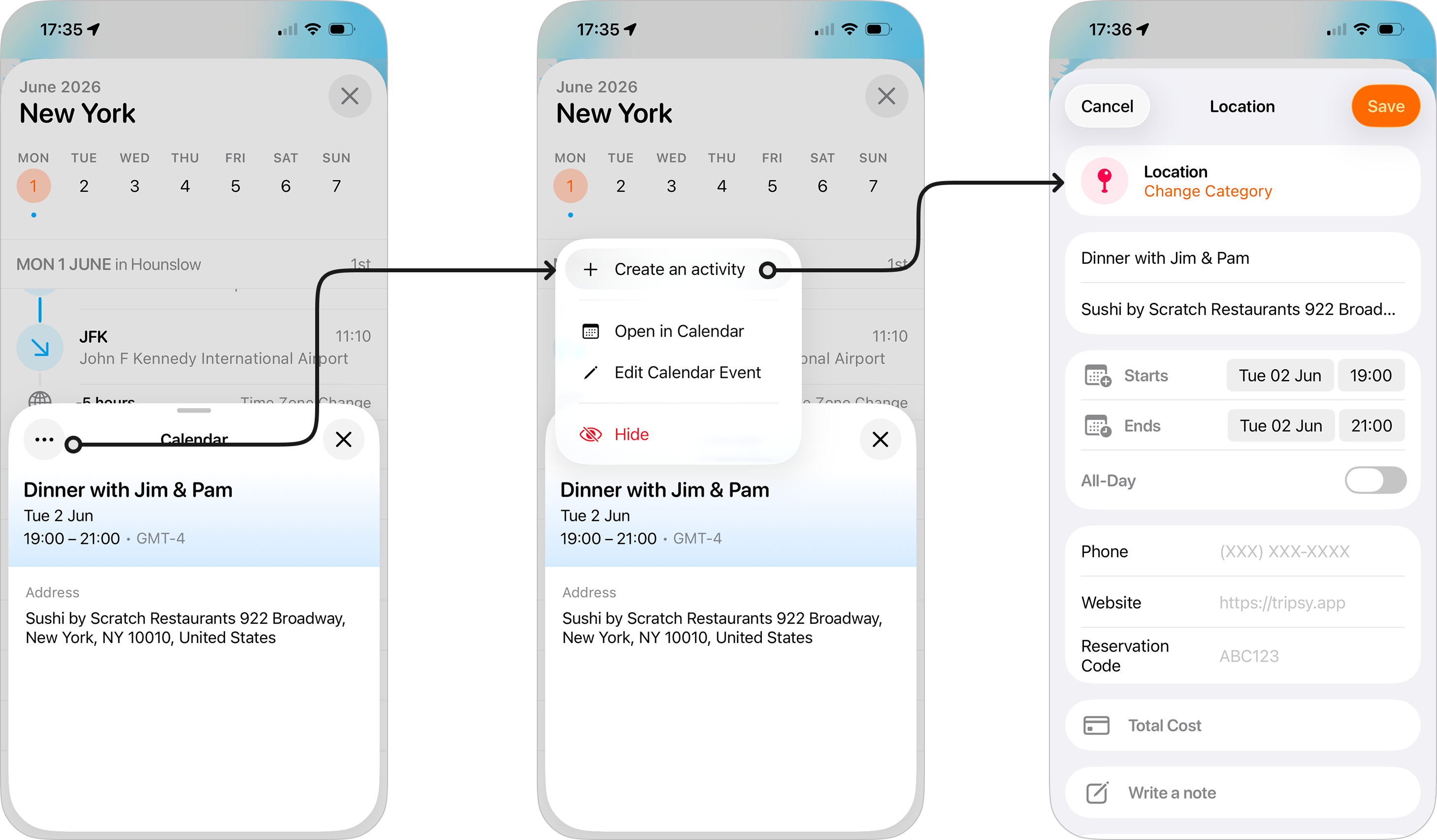 For any other type of calendar event, you can tap on the three dots at the top-left of the event details and choose Create Activity. We'll pick up the dates and times, including the timezone, of the event, and you can then choose a suitable category for the activity. Simply tap Save to turn add this as an activity in your itinerary.
