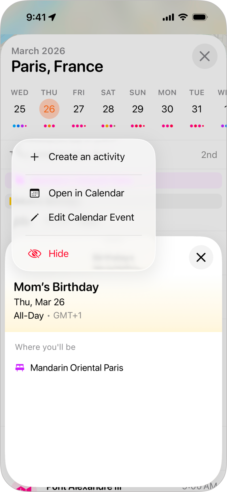To view more details of the calendar event, just tap on the event in question and you'll see the details pop-up. You'll see the calendar the event is from, the dates and times of the event, along with any location details and notes added from your calendar app. We'll also show you any activities that match the times of the event under Where you'll be.