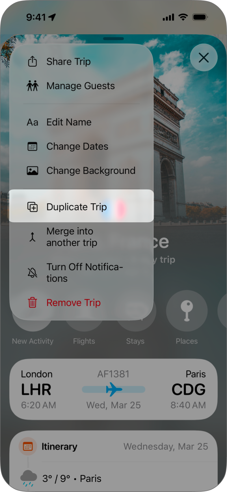 Duplicating a trip starts by accessing the trip's menu via the three dots at the top-left of the trip you want to duplicate, then just tap Duplicate Trip and Tripsy will guide you through the process.