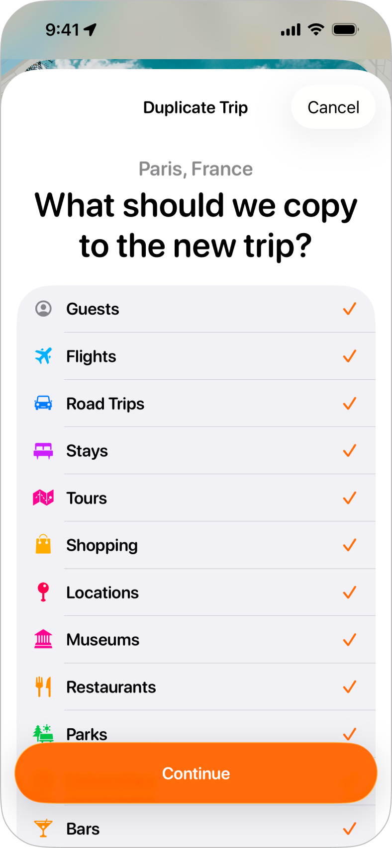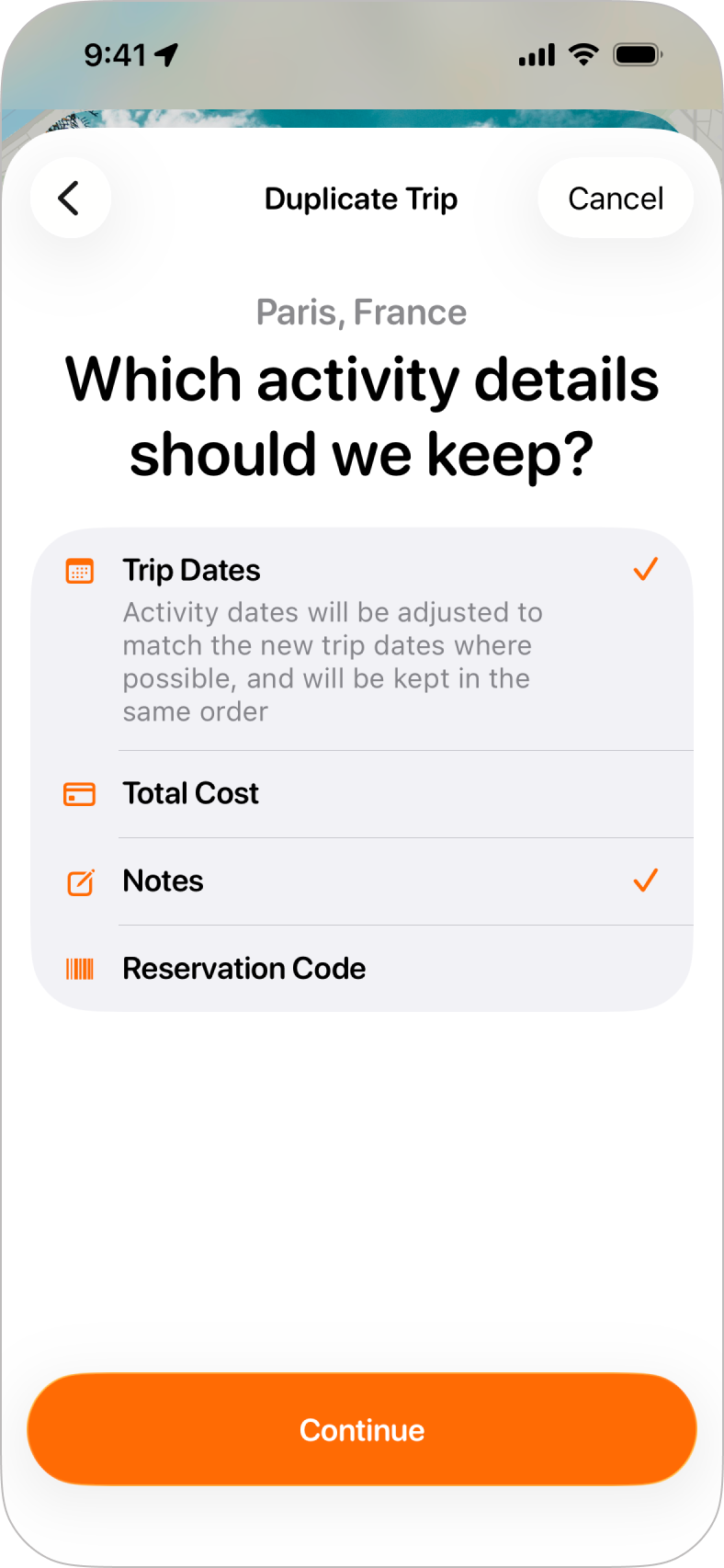Step 1: Choosing What to CopyWhen you tap on Duplicate Trip from the trip's menu, you'll be shown a list of the elements of the original trip you'd like to copy to the new trip. If you had invited guests to the original trip, or this trip was shared with you, you'll also see an option to select Guests as an option to copy. Once you're happy that you've selected the elements to copy, tap Continue to move on to the next step. |