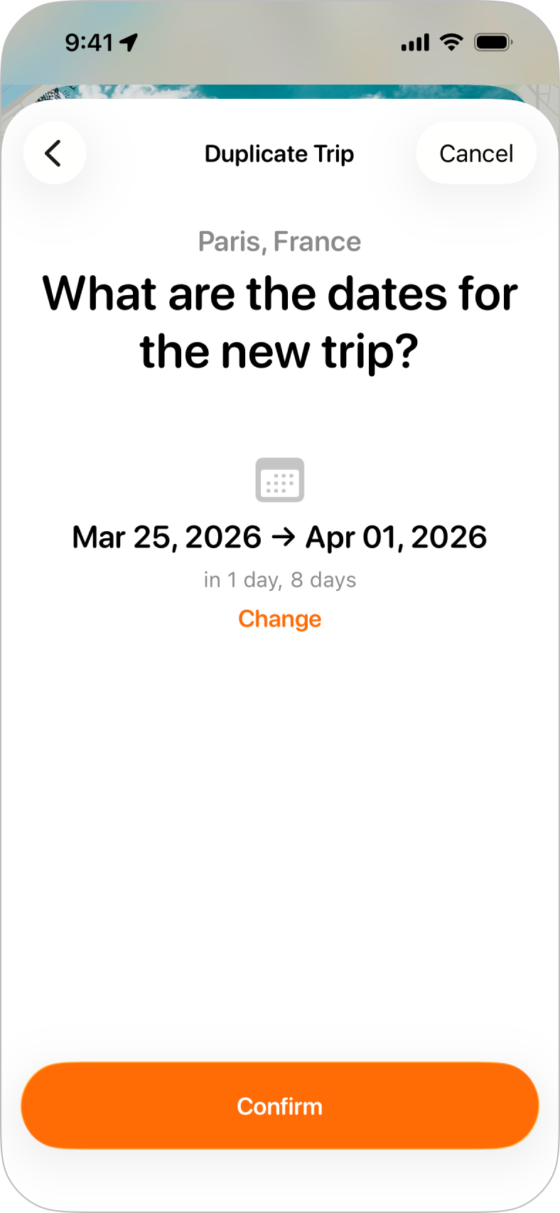 Step 2: Choosing DatesWhen you duplicate a trip, you can choose to keep the existing dates (which you may want to do if you're copying a trip shared by a friend but want to add your own activities that they aren't involved in), or tap Change to set new dates for the trip. |