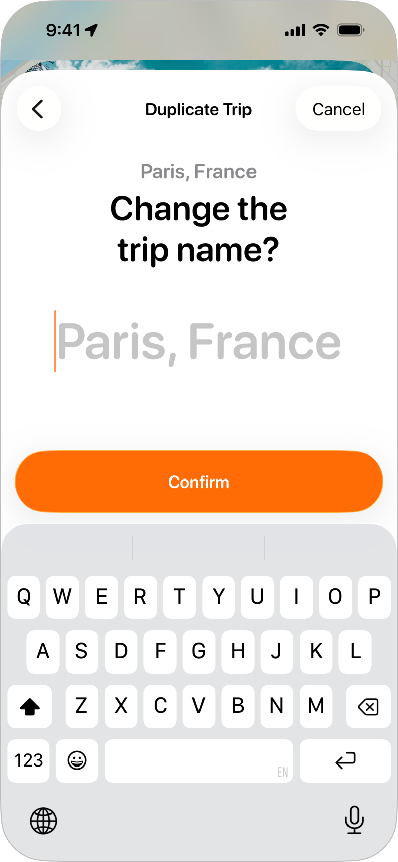Step 4: Trip NameIf you want to change the name of the trip from the original, you can start typing the new name for your trip. If you don't type anything, the name of the original trip will be used. Tap Confirm once you're happy with the trip's name, |