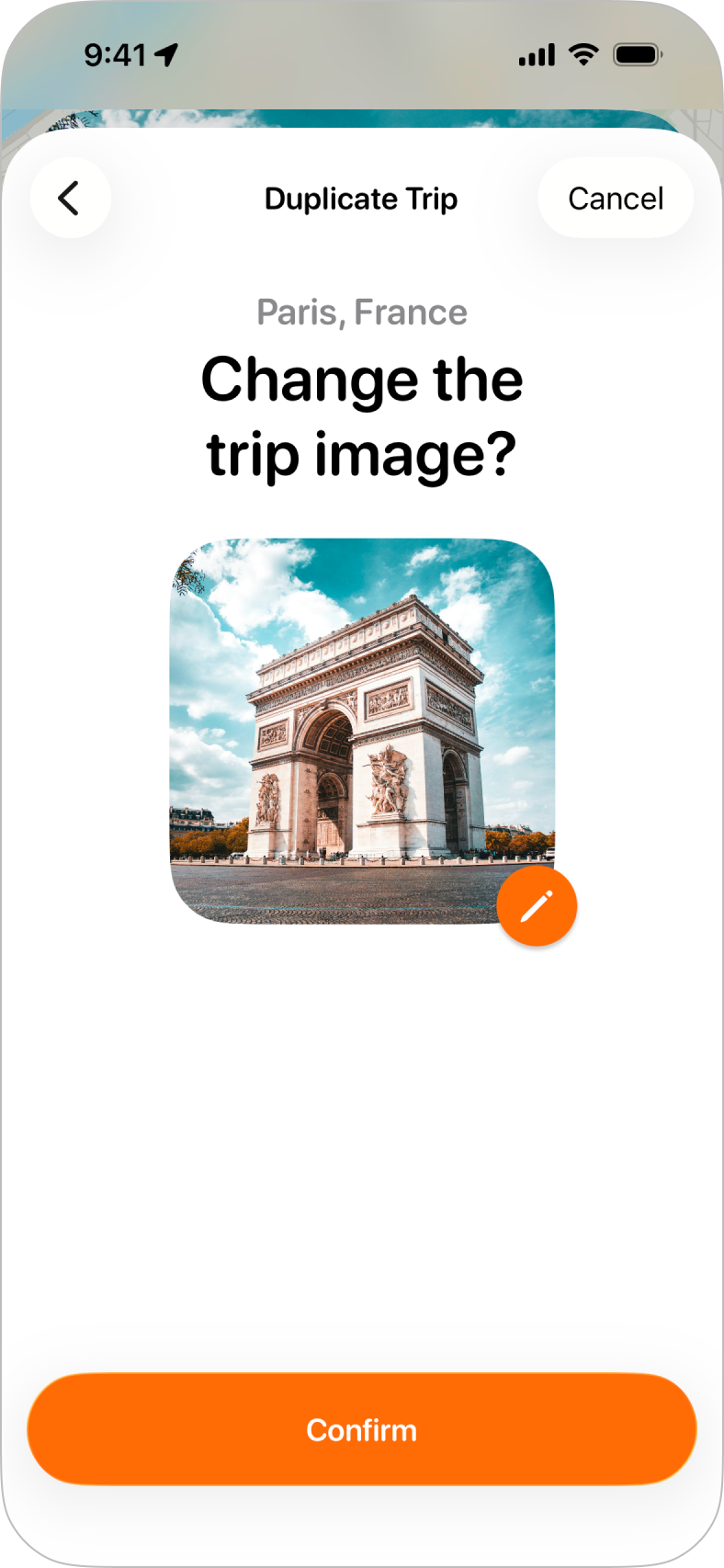 Step 5: Trip ImageTripsy will copy the image for the original trip by default, but tapping the pencil icon at the bottom right of the image will let you choose a new image for the trip. You'll see the same options to choose a new image as you would when changing a trip's background. |