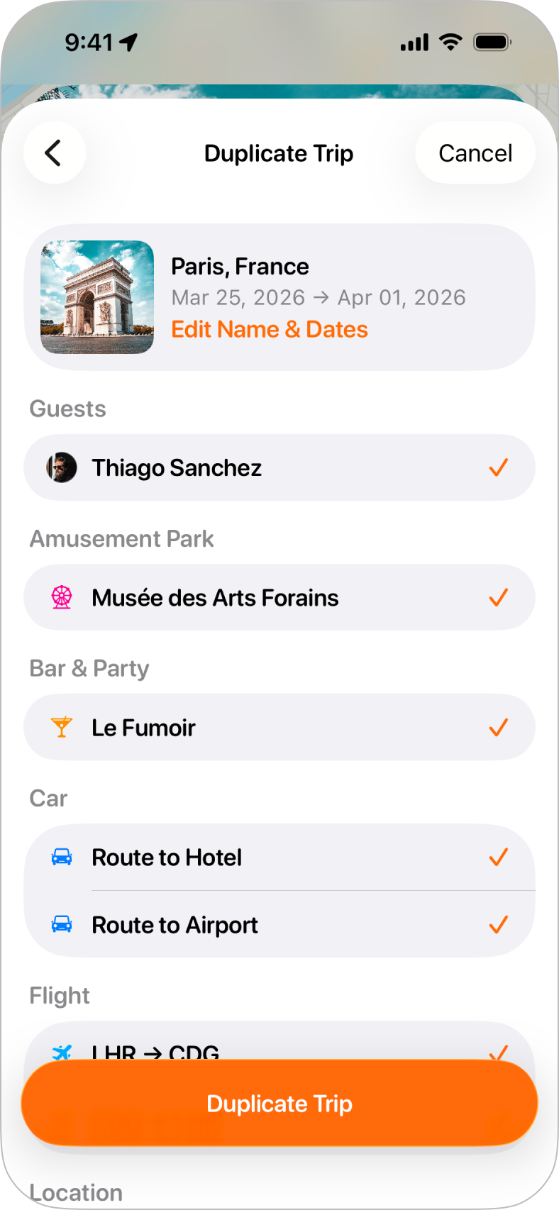 Step 6: Confirming DetailsBefore you tap Duplicate Trip, you can see a full summary of everything that will be duplicated into the new trip. If you don't want certain elements, such as a specific guest or an activity to be duplicated, just uncheck those elements and they will be removed from the new trip for you. That's it, you've duplicated a trip and you should see this along with all your other trips. |